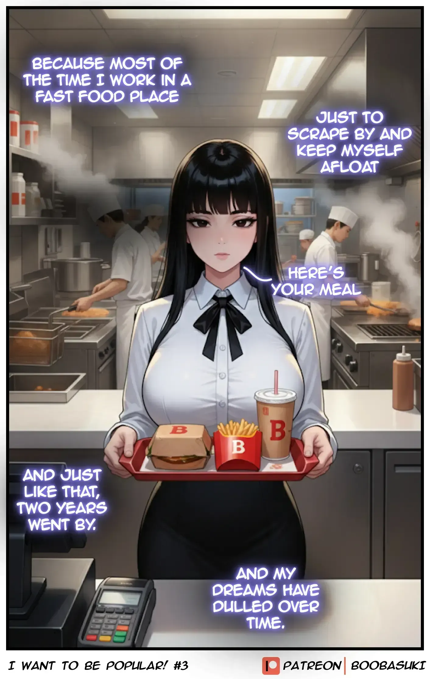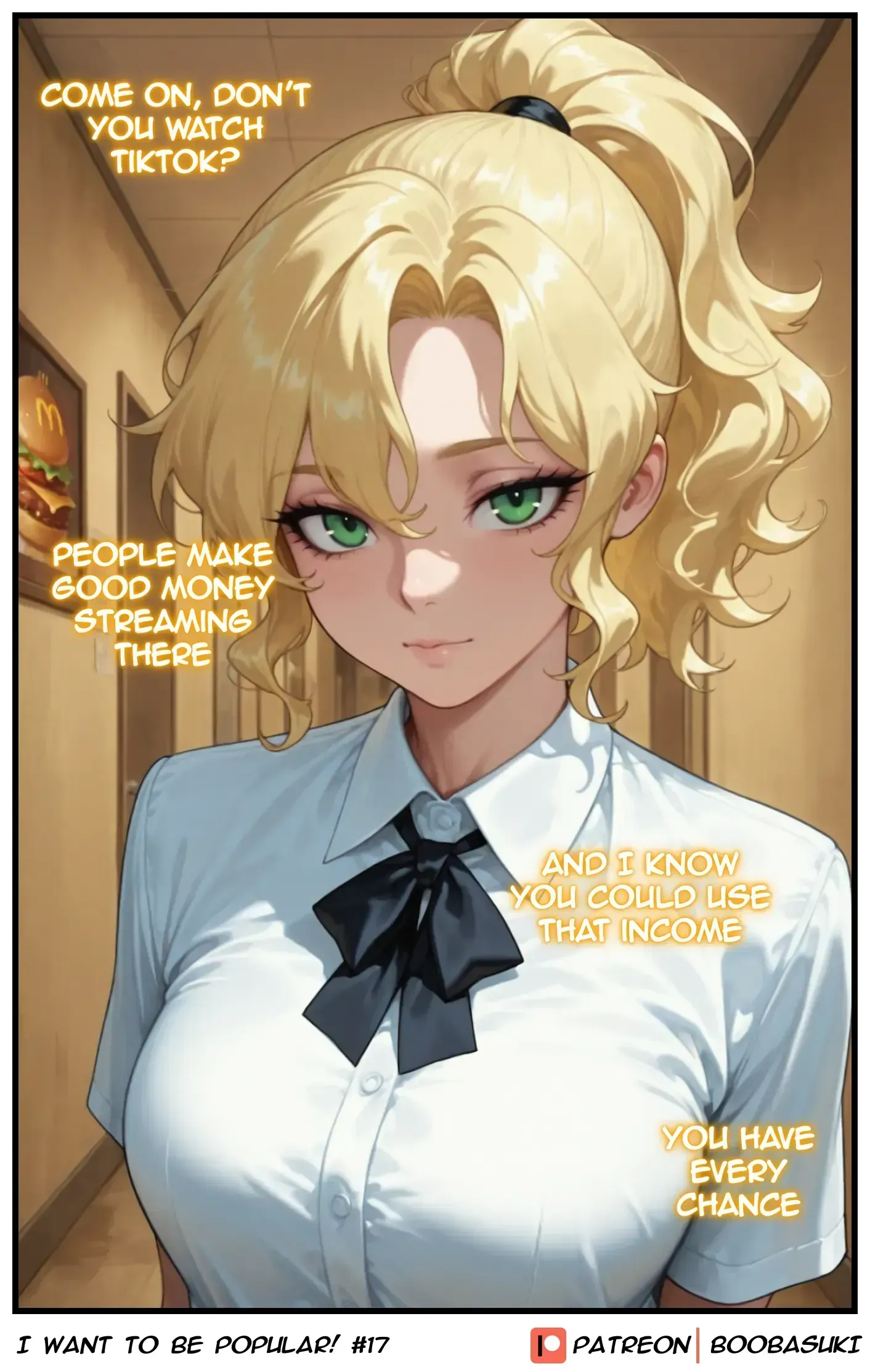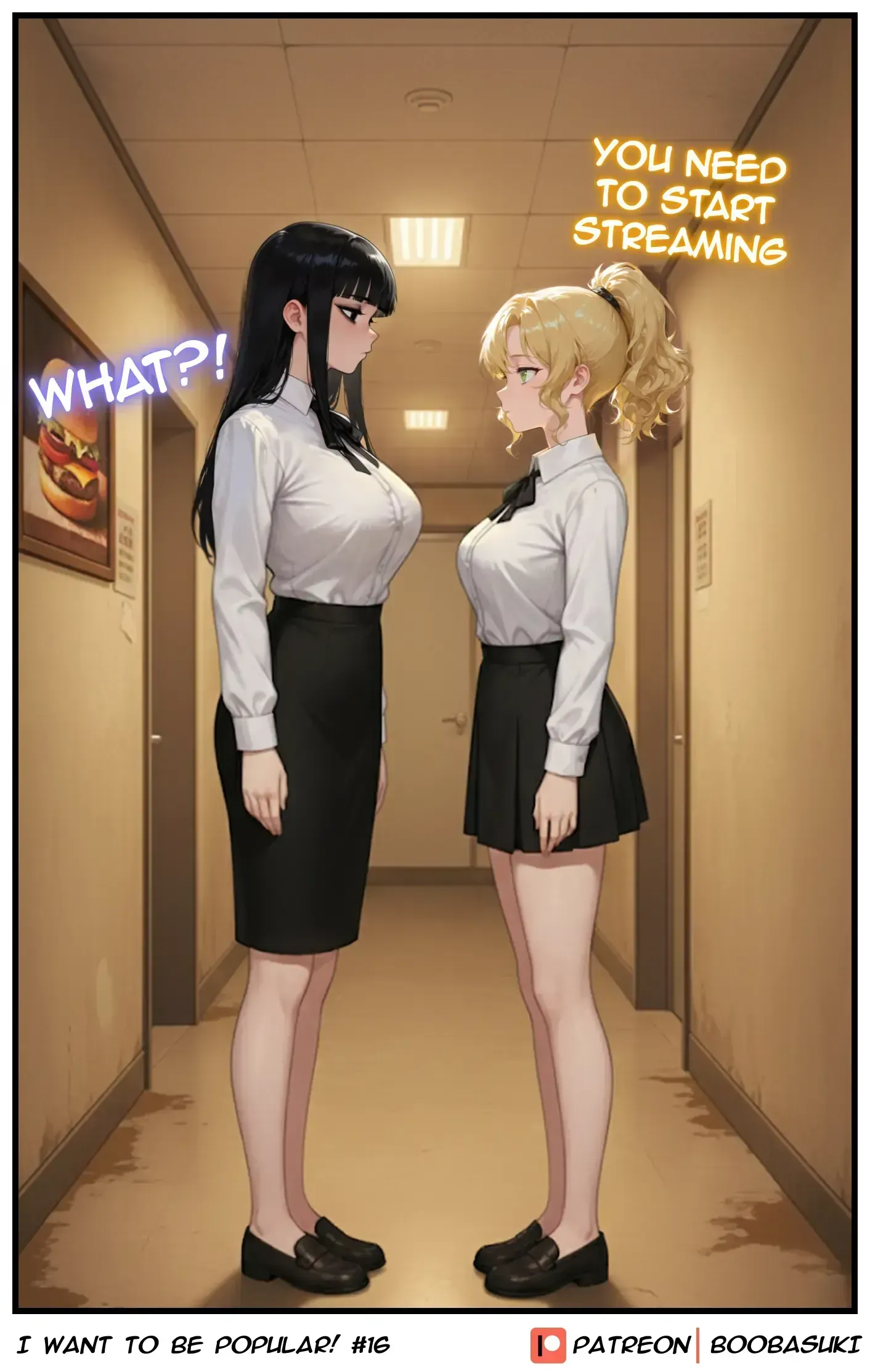 I Want to Be Popular is a story about a girl who works in the food service industry but dreams of popularity and attention. Deciding to try herself as a streamer, she discovers the platform’s unusual features: with them, she can change the size and shape of her body right during the broadcast!
